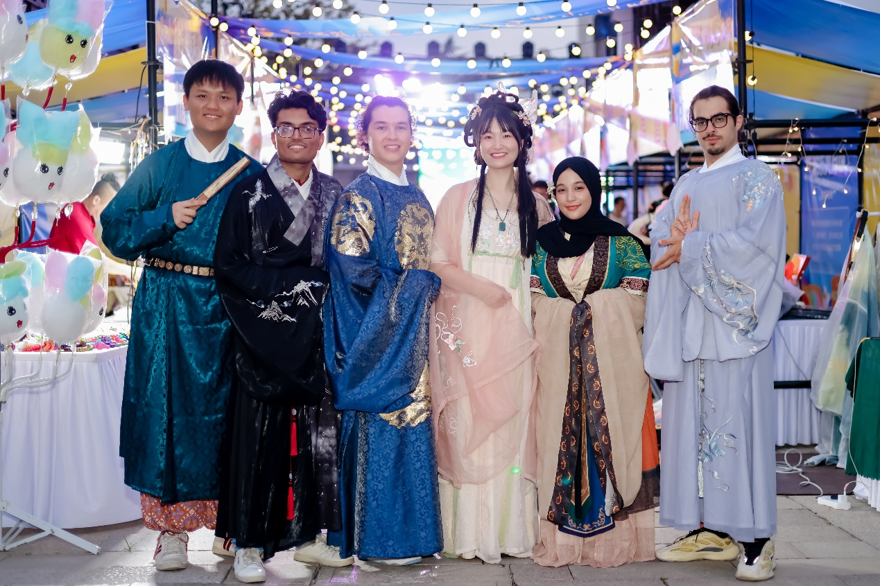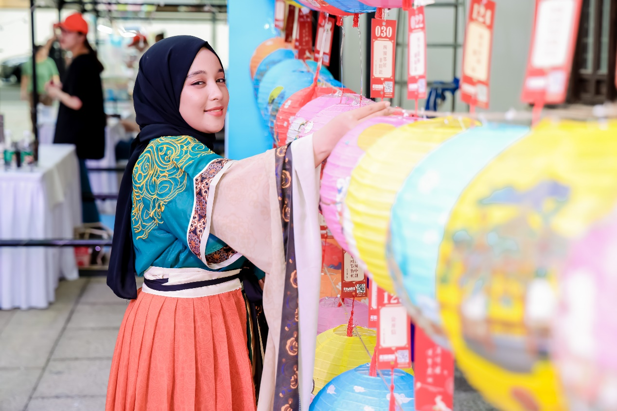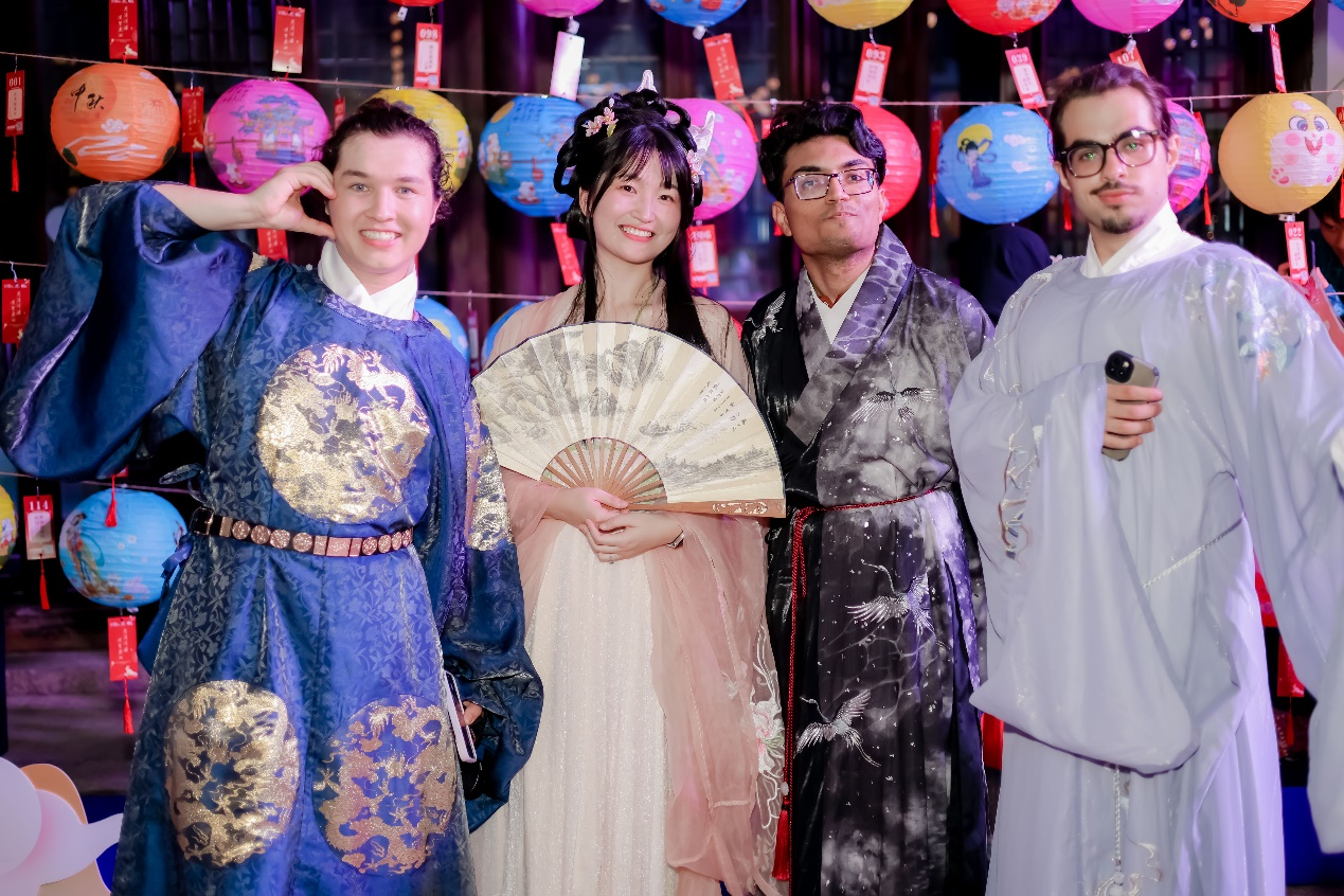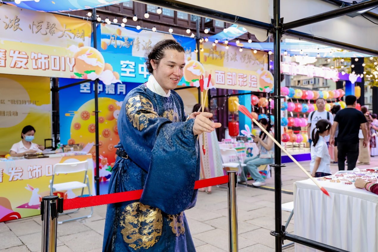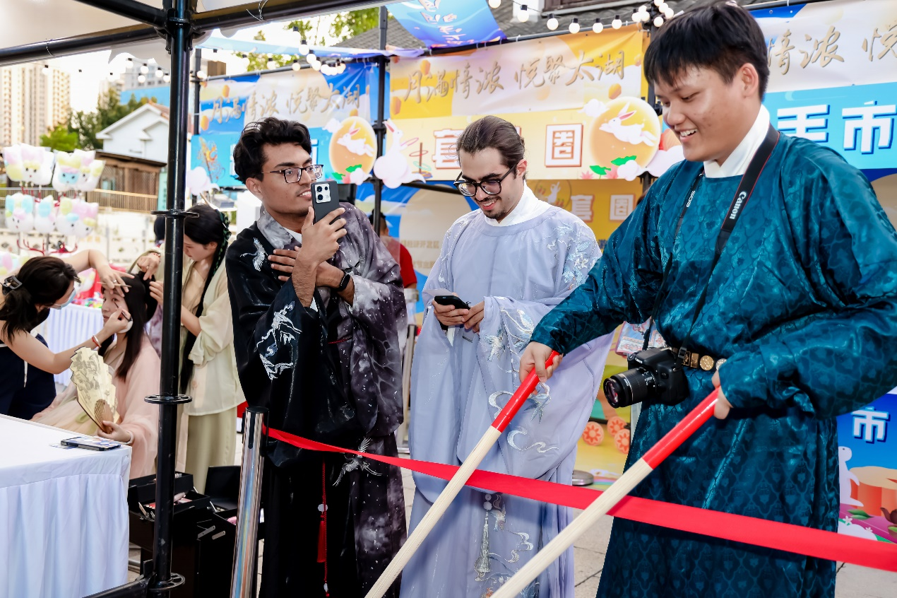 活动初始,来自马来西亚、乌兹别克斯坦、埃及、摩洛哥和巴基斯坦的无锡学院校园国际大使身着中国汉服,深刻领略到中华服饰的古韵与独特魅力。继而,他们穿梭于热闹的中秋集市,尽情体验投壶、套圈、猜灯谜等各类传统文化项目。