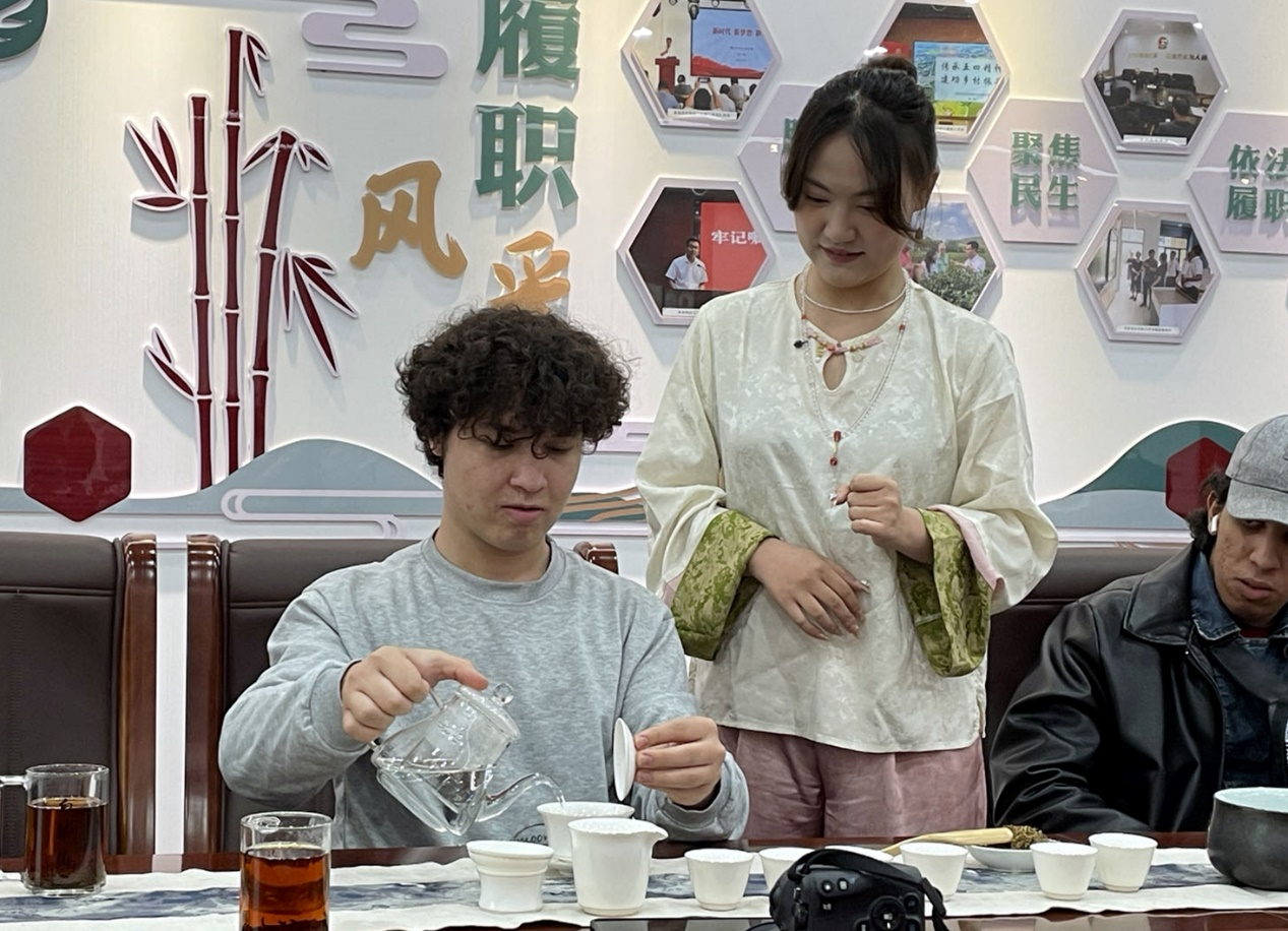 午餐后,留学生们来到了锡北镇白茶园。在这里,他们不仅学习了采茶技巧和茶艺知识,还亲手体验了采茶和泡茶的过程。通过这一活动,留学生们对无锡的茶文化有了更直观的感受和认识。