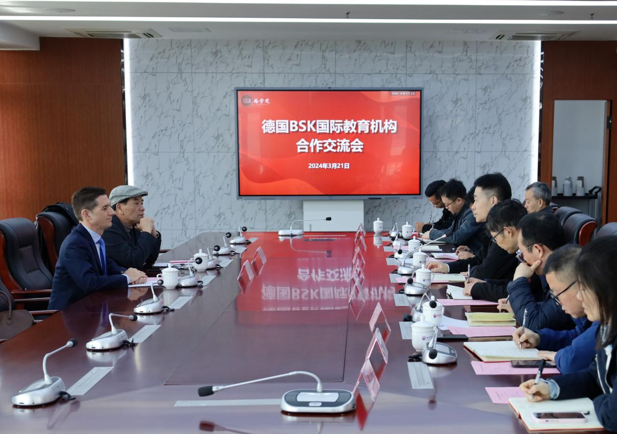 3月21日,德国BSK国际教育机构亚洲事务执行总裁Kai-Arne Fiedler,中国事务主任、驻华代表陈钢来访我校。校党委书记杨建新,国际合作与交流处、教务处、人事处、学工处等相关部门和二级学院负责人出席会议。