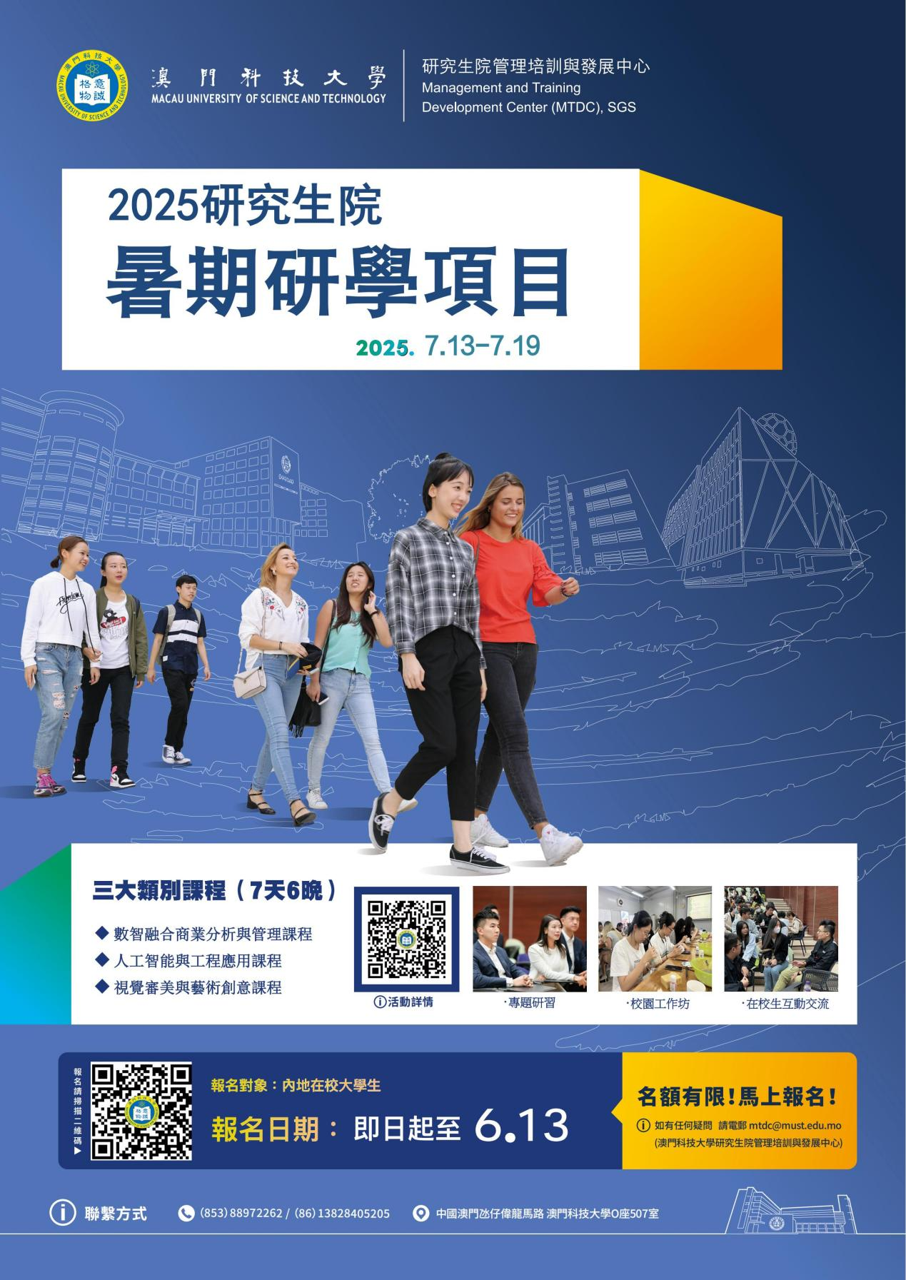 基于我校与澳门科技大学的合作交流协议,学校开通澳门科技大学2025年暑期研学项目报名通道,现将有关事项通知如下: