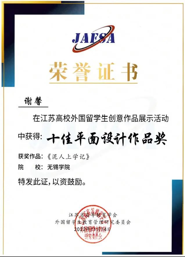 学院不断深化留学生人才培养的内涵式发展,切实提高留学生教育教学和人才培养质量。获评江苏省来华留学生教育先进集体、无锡市建设国际友好学校先进单位,外籍教师获江苏高校外国留学生教学观摩比赛二等奖和三等奖、无锡市人民友好使者,留学生获江苏高校外国留学生创意作品展示活动十佳平面设计作品、江苏高校外国留学生短视频大赛优秀作品奖、江苏省教师国家通用语言文字教学能力大赛留学生组三等奖等,多人获江苏省外国留学生教育管理先进个人、江苏省优秀留学生辅导员、在锡高校辅导员素质能力比赛一等奖。