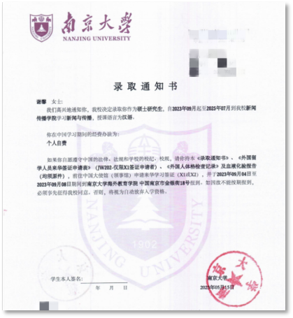 留学生谢馨同学的录取通知书