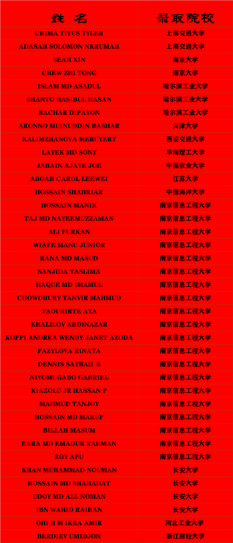无锡学院国际教育学院2023届留学生毕业工作正在有序展开,截止到6月10日,我院留学生毕业生已有39人被国内13所高校录取为硕士研究生。录取的高校均为国内知名院校,有上海交通大学、南京大学、哈尔滨工业大学、天津大学、西安交通大学、华南理工大学、中国农业大学、江苏大学、中国海洋大学、南京信息工程大学、长安大学、河北工业大学、浙江财经大学等。